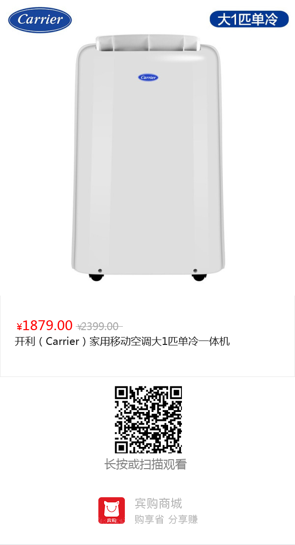 开利(Carrier)移动空调大1匹单冷 家用可移动空调厨房小空调一体机空调 51PD026C40200210